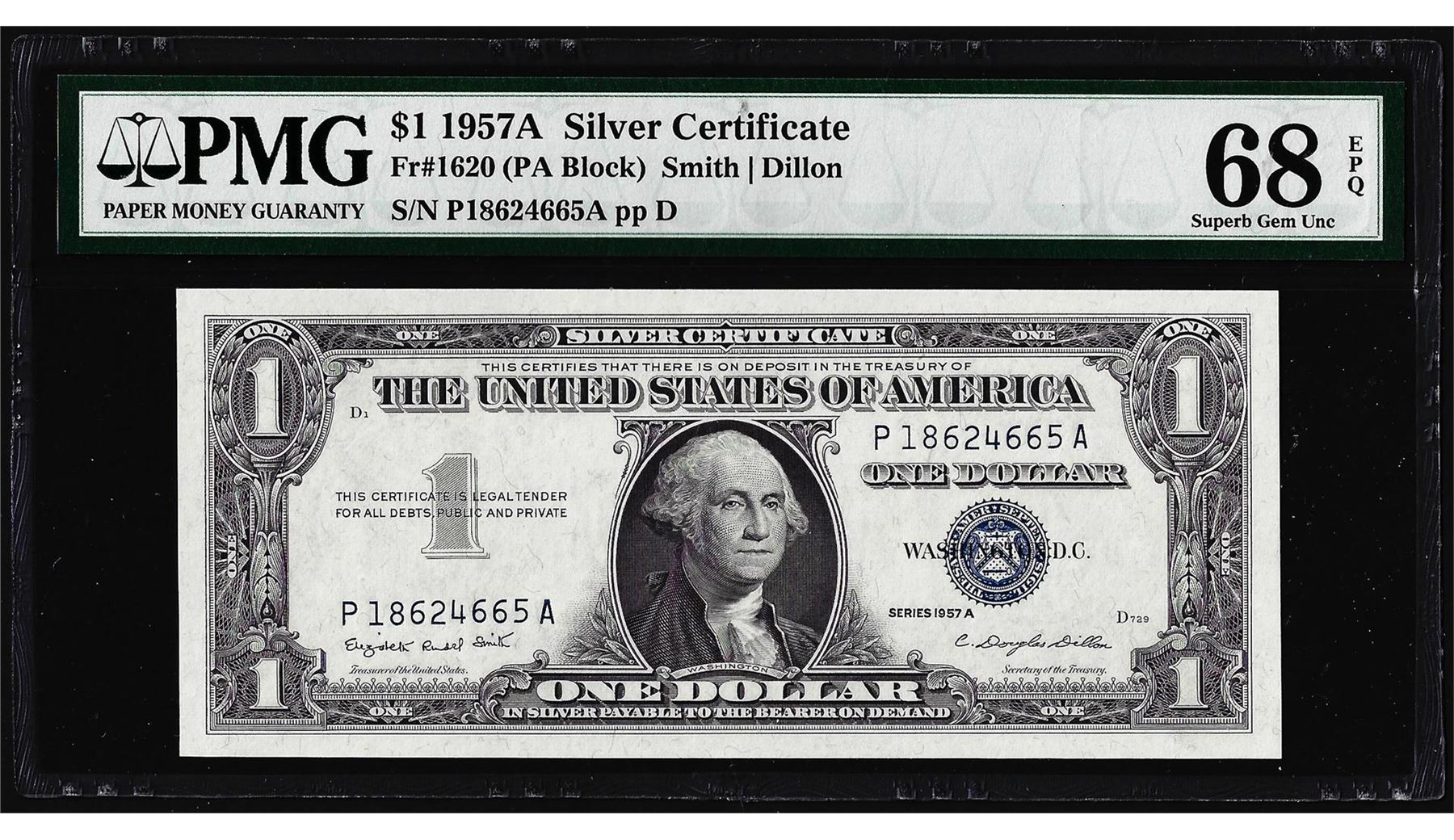 One 1957A $1 Silver Certificate Note Fr.1620 PMG Superb Gem Uncirculated 68EPQ. PMG Certified.