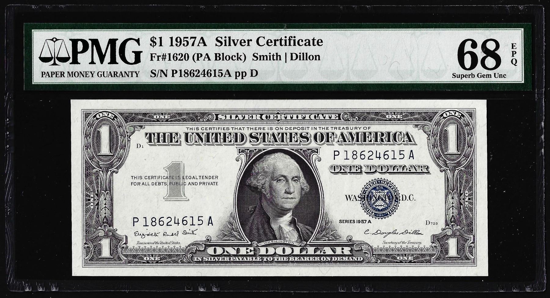 1957A $1 Silver Certificate Note Fr.1620 PMG Superb Gem Uncirculated 68EPQ