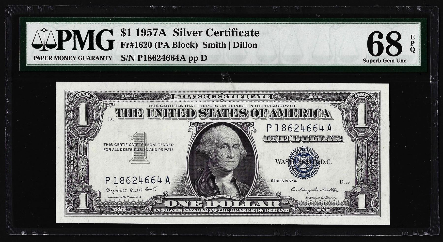 One 1957A $1 Silver Certificate Note Fr.1620 PMG Superb Gem Uncirculated 68EPQ.