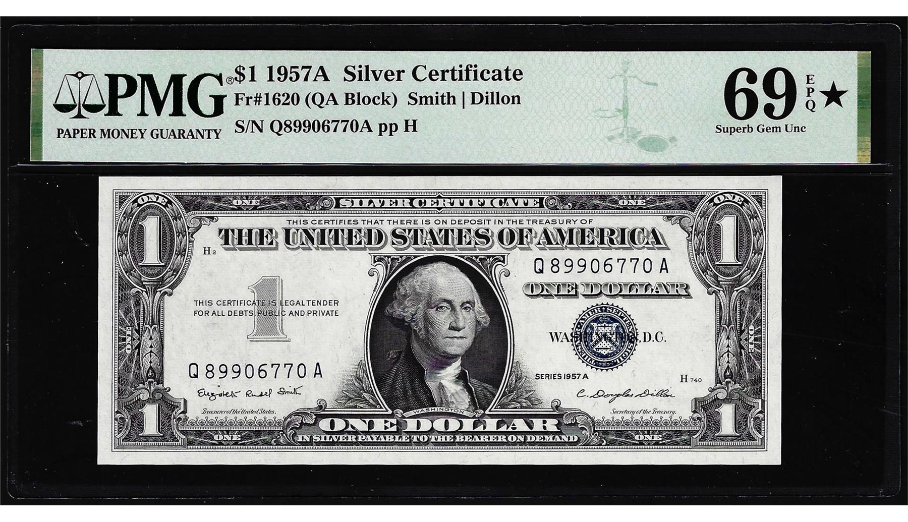 One 1957A $1 Silver Certificate Note Fr.1620 PMG Superb Gem Uncirculated 69EPQ* STAR. PMG Certified.