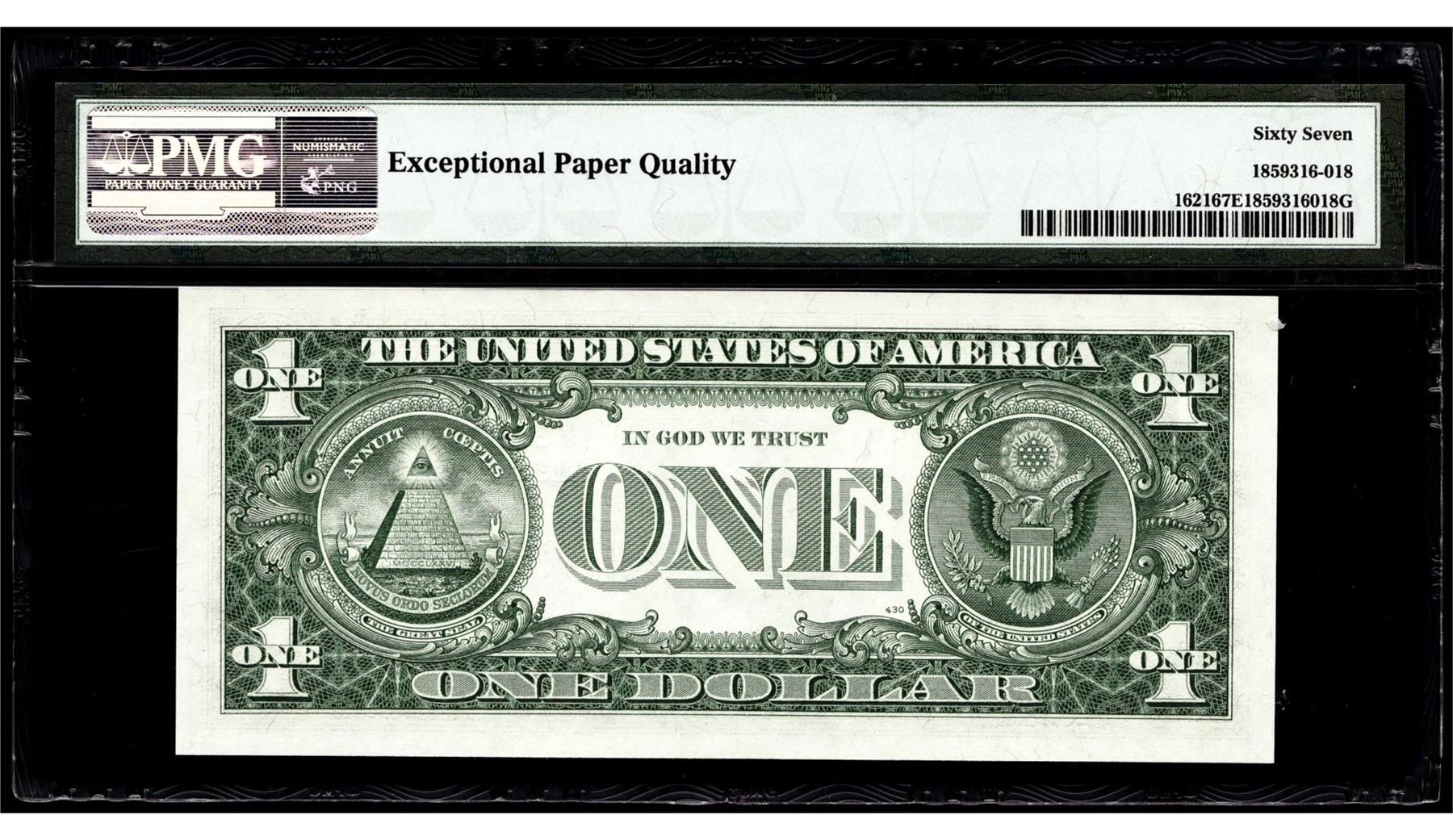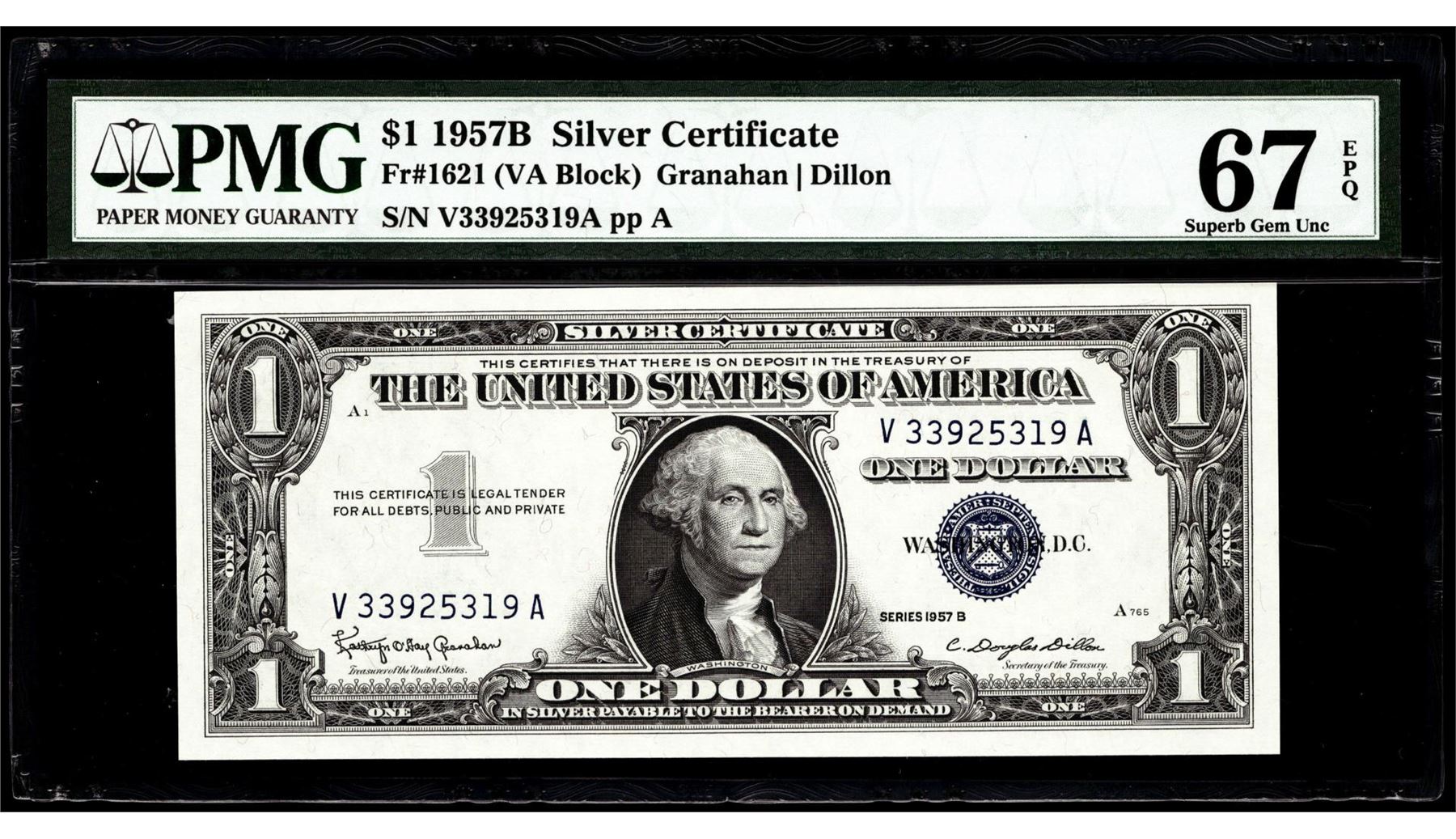 One 1957B $1 Silver Certificate Note Fr.1621 PMG Superb Gem Unc 67EPQ. PMG Certified.