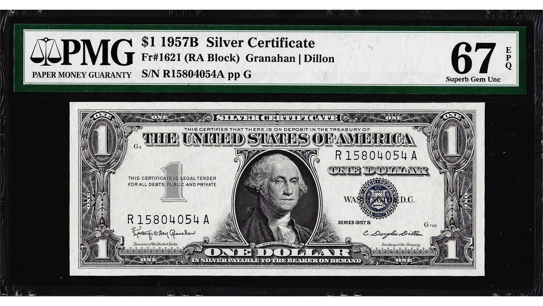 One 1957B $1 Silver Certificate Note Fr.1621 PMG Superb Gem Uncirculated 67EPQ. PMG Certified.