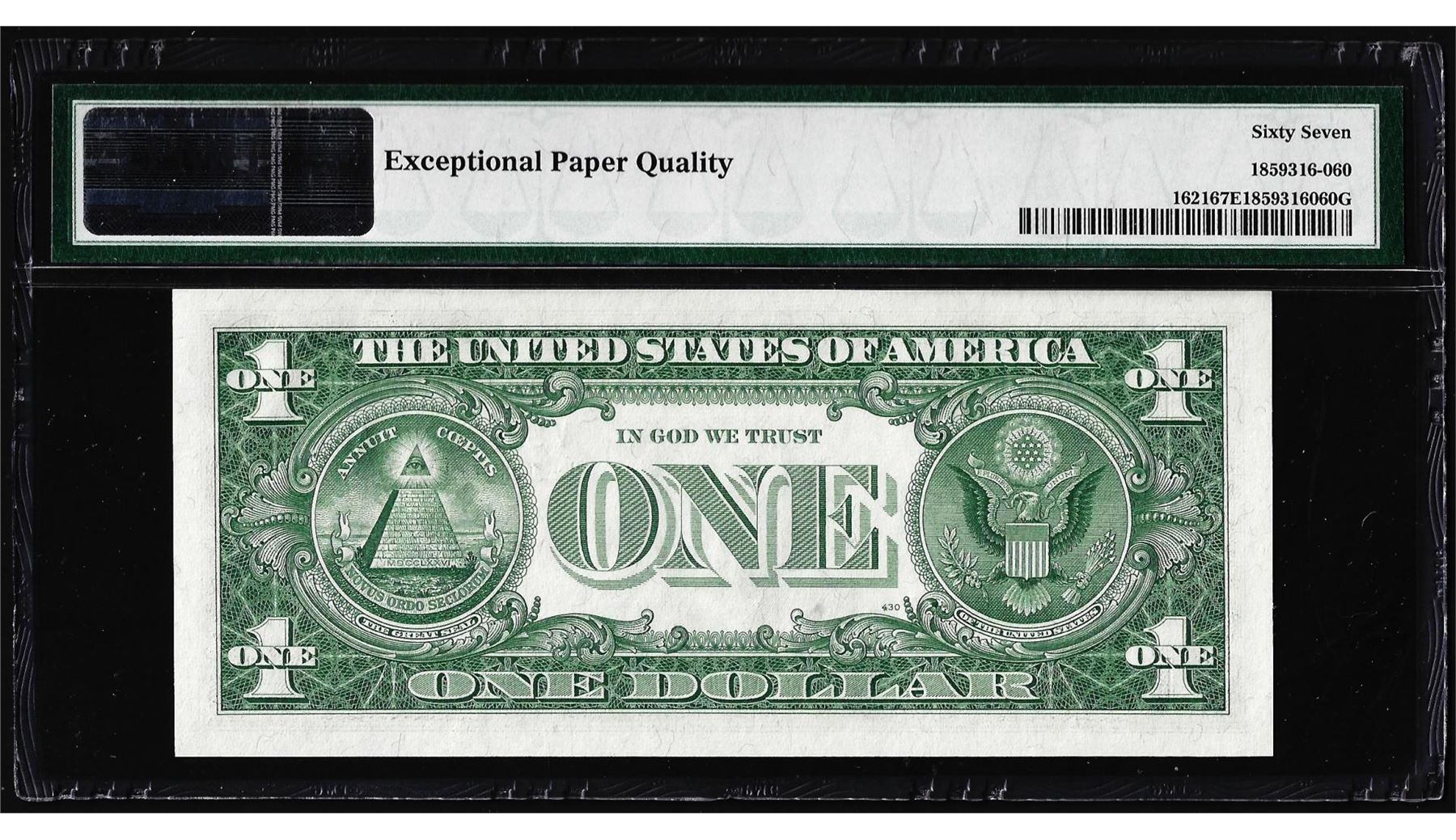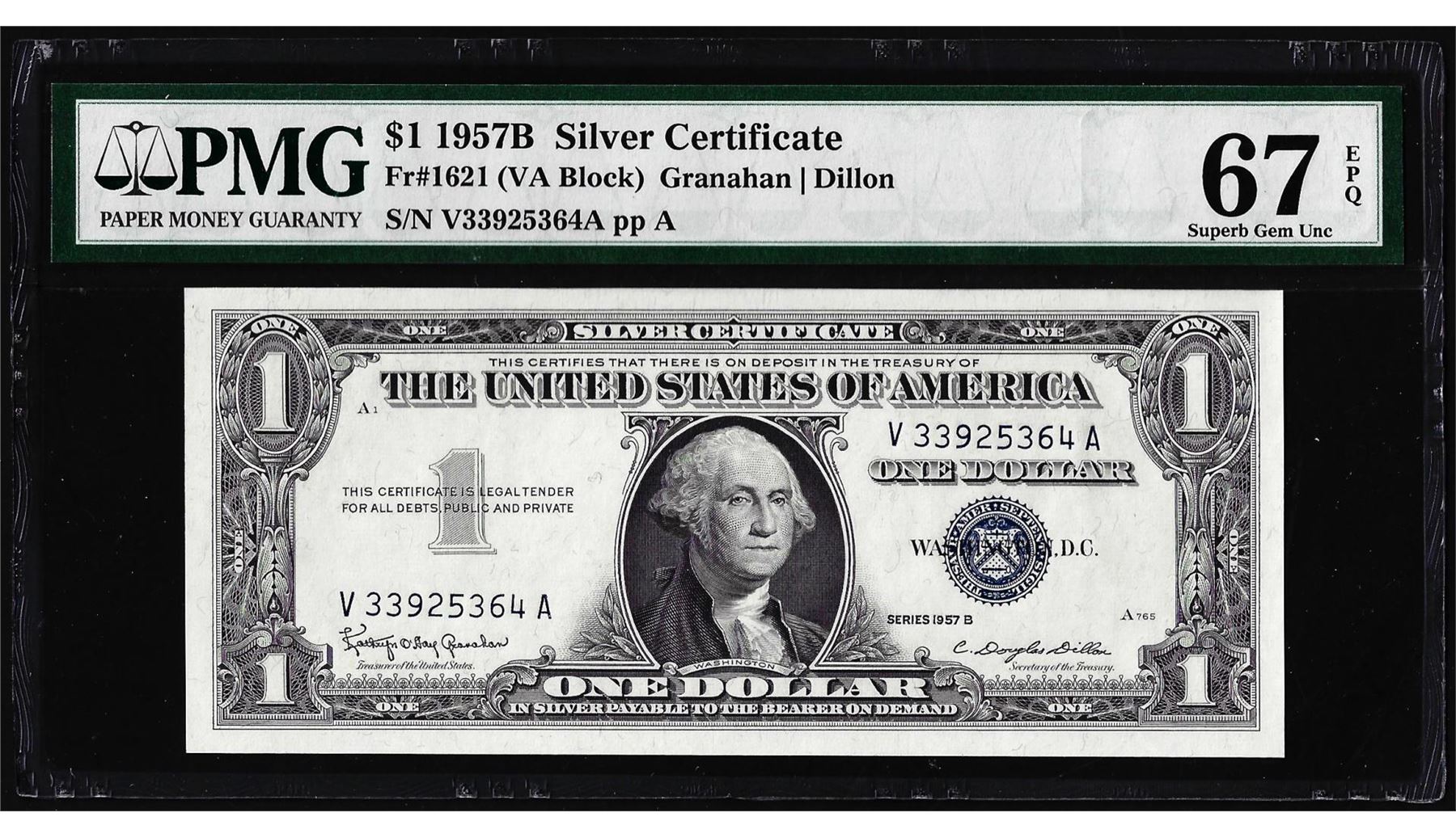 One 1957B $1 Silver Certificate Note Fr.1621 PMG Superb Gem Uncirculated 67EPQ. PMG Certified.