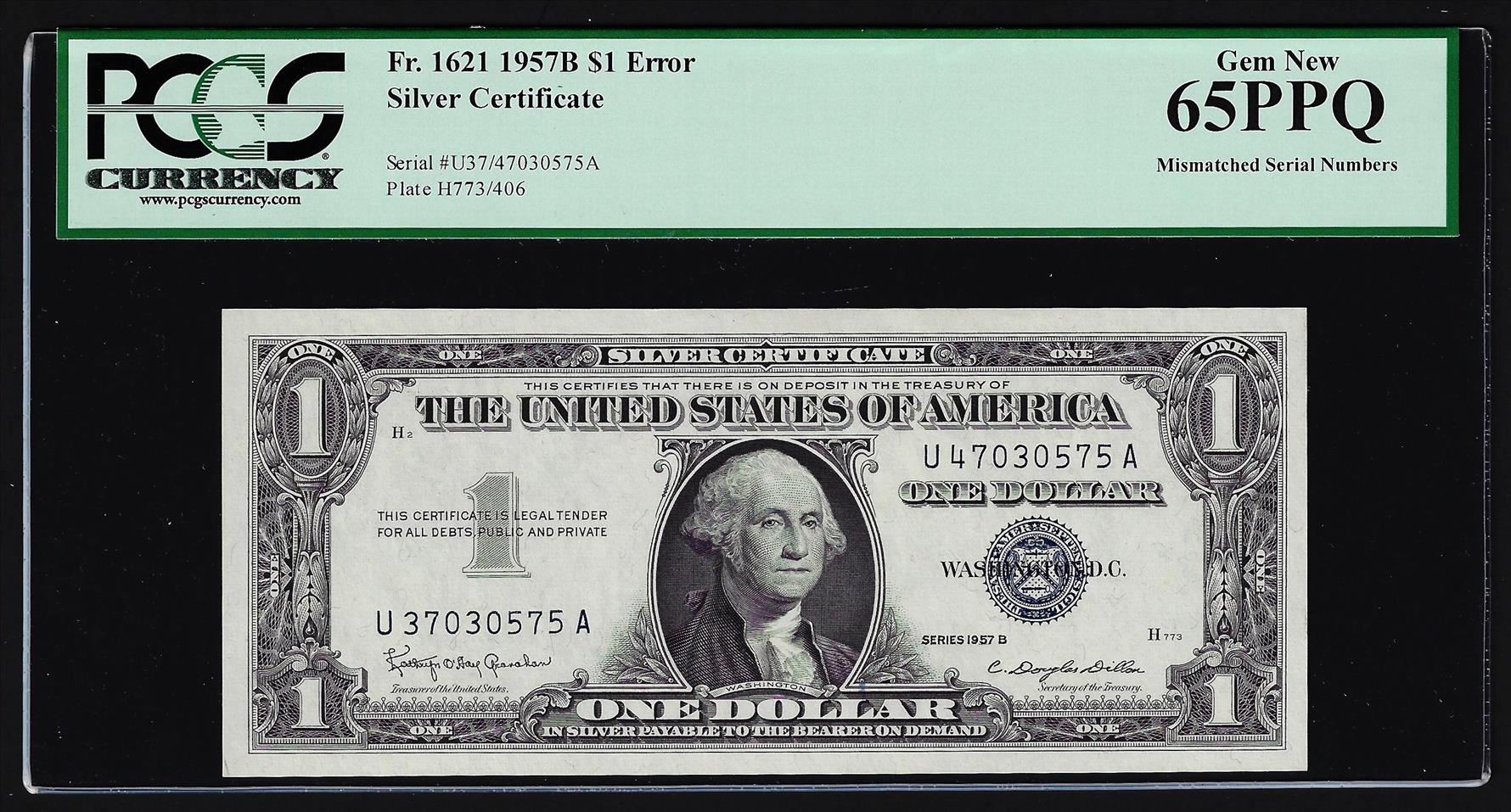 One 1957B $1 Silver Certificate Note Mismatched Serial Numbers ERROR PCGS 65PPQ. PCGS Graded.