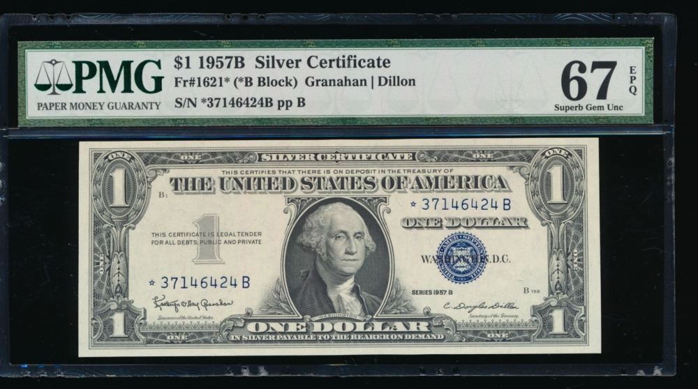 One 1957B $1 Silver Certificate STAR Note PMG 67EPQ.