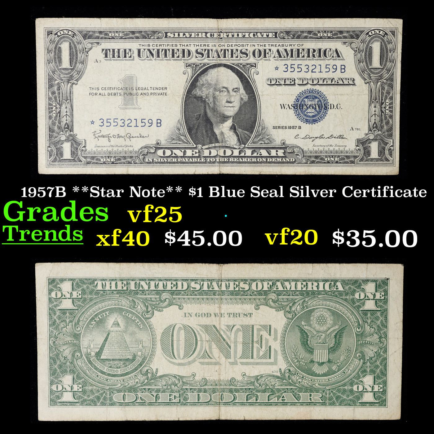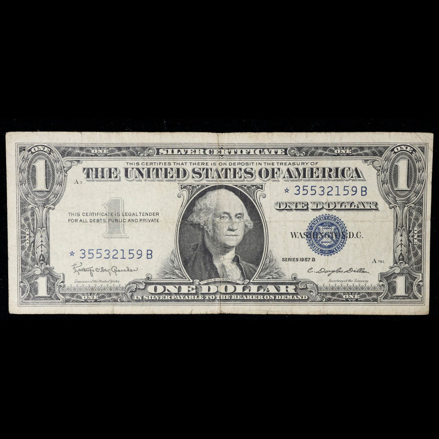 1957B **Star Note** $1 Blue Seal Silver Certificate Grades vf+. On June 4th 1963, President Kennedy issued Executive Order 11110, ordering that silver certificates be phased out. No one knew it would be his last executive order, and no one knew that it would make these 1957-B Silver Certificates sought-after collectibles today. His order caused folks to take notice and save a small number of these 1957-B $1 Silver Certificates-they were only 14% of the total 1957 Silver Certs printed. These silver certificates feature George Washington, a blue seal, and the following wording: “Silver Certificate This certifies that there is on deposit in the treasury of The United States of America One Dollar In silver payable on demand”