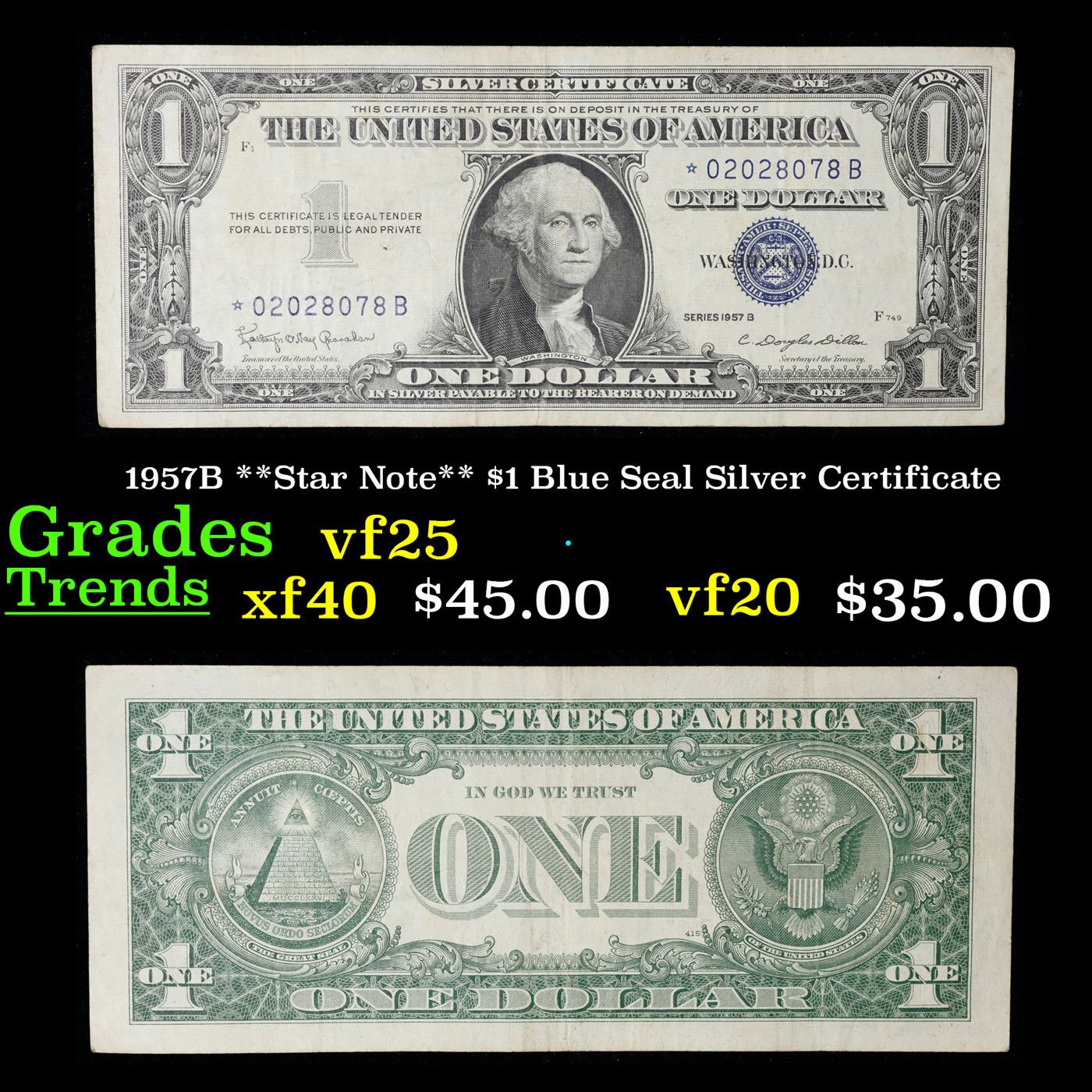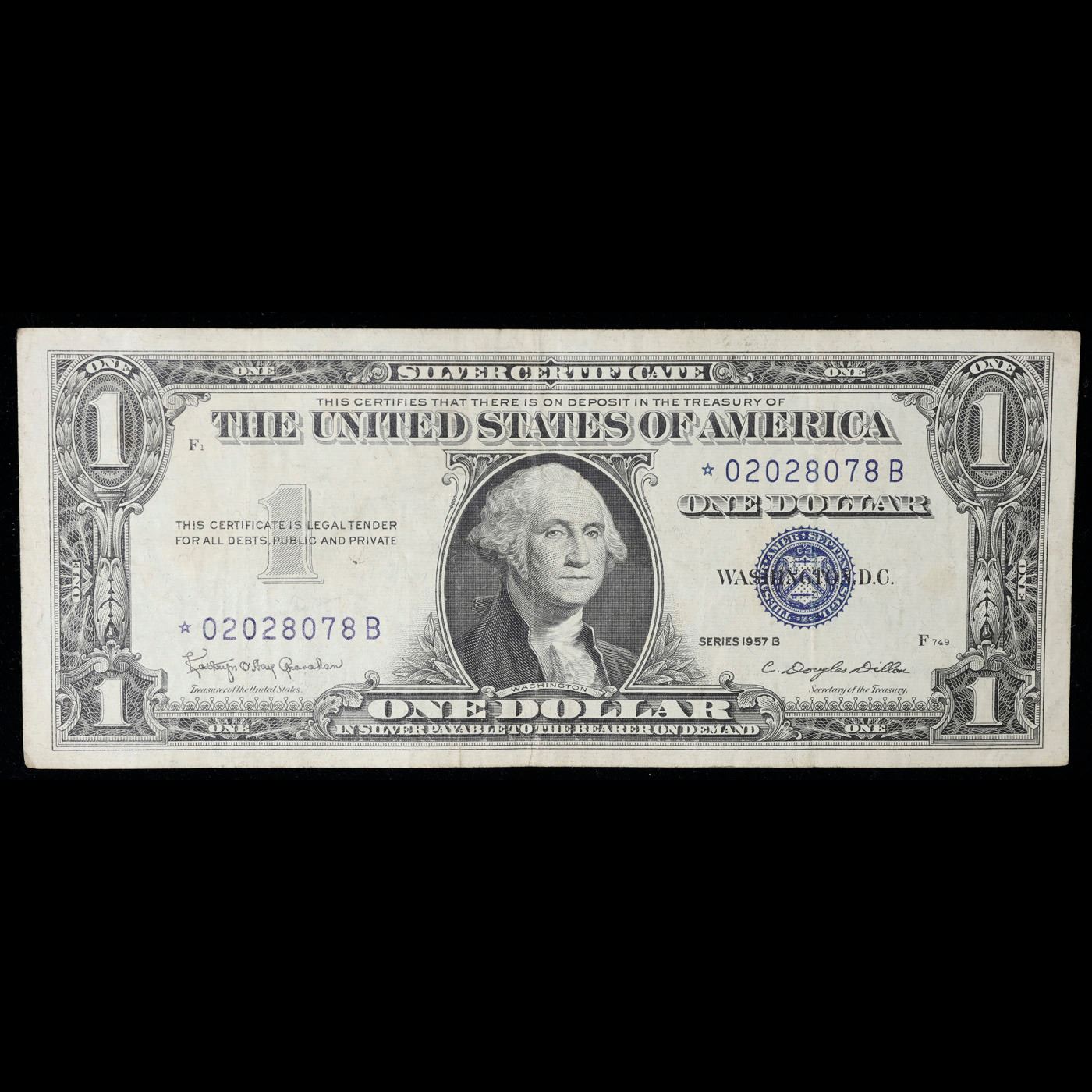 1957B **Star Note** $1 Blue Seal Silver Certificate Grades vf+. On June 4th 1963, President Kennedy issued Executive Order 11110, ordering that silver certificates be phased out. No one knew it would be his last executive order, and no one knew that it would make these 1957-B Silver Certificates sought-after collectibles today. His order caused folks to take notice and save a small number of these 1957-B $1 Silver Certificates-they were only 14% of the total 1957 Silver Certs printed. These silver certificates feature George Washington, a blue seal, and the following wording: “Silver Certificate This certifies that there is on deposit in the treasury of The United States of America One Dollar In silver payable on demand”
