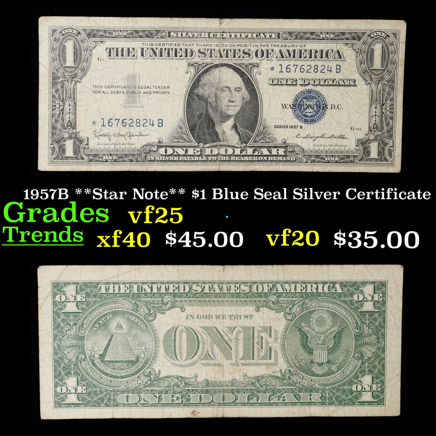 1957B **Star Note** $1 Blue Seal Silver Certificate Grades vf+. On June 4th 1963, President Kennedy issued Executive Order 11110, ordering that silver certificates be phased out. No one knew it would be his last executive order, and no one knew that it would make these 1957-B Silver Certificates sought-after collectibles today. His order caused folks to take notice and save a small number of these 1957-B $1 Silver Certificates-they were only 14% of the total 1957 Silver Certs printed. These silver certificates feature George Washington, a blue seal, and the following wording: “Silver Certificate This certifies that there is on deposit in the treasury of The United States of America One Dollar In silver payable on demand”