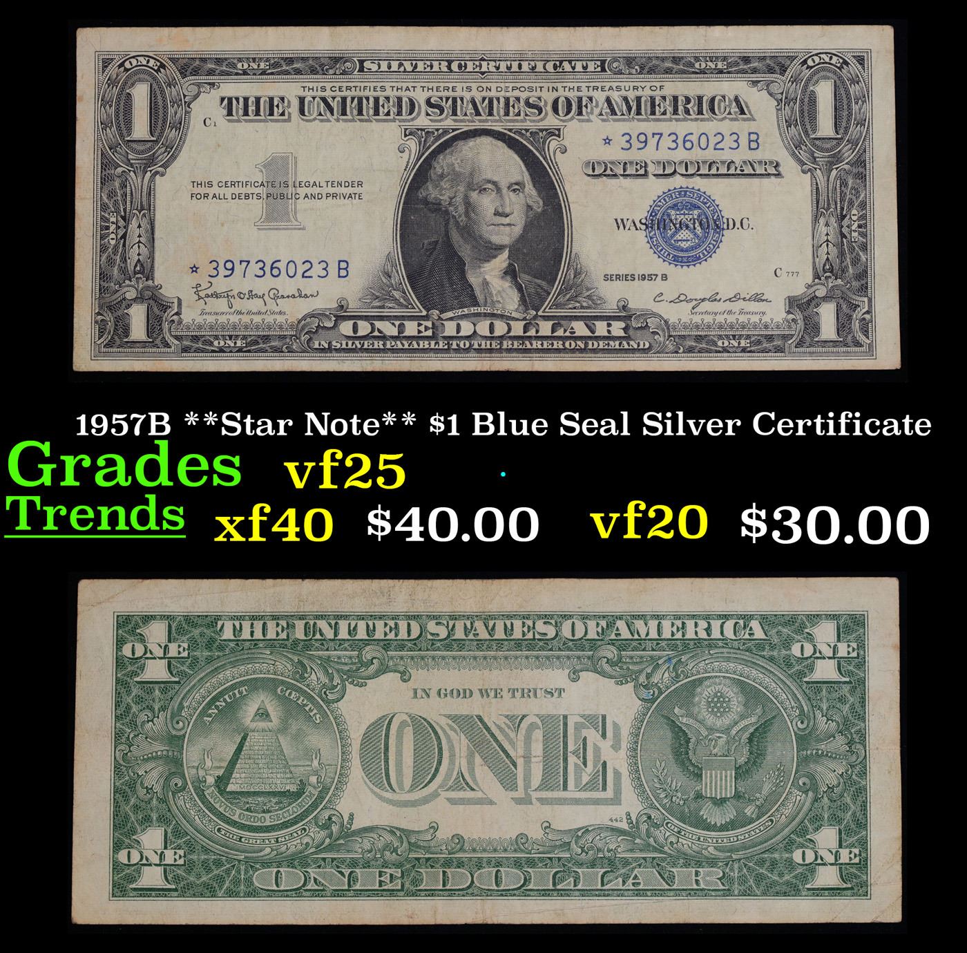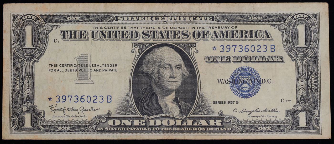 1957B **Star Note** $1 Blue Seal Silver Certificate Grades vf+. On June 4th 1963, President Kennedy issued Executive Order 11110, ordering that silver certificates be phased out. No one knew it would be his last executive order, and no one knew that it would make these 1957-B Silver Certificates sought-after collectibles today. His order caused folks to take notice and save a small number of these 1957-B $1 Silver Certificates-they were only 14% of the total 1957 Silver Certs printed. These silver certificates feature George Washington, a blue seal, and the following wording: “Silver Certificate This certifies that there is on deposit in the treasury of The United States of America One Dollar In silver payable on demand”