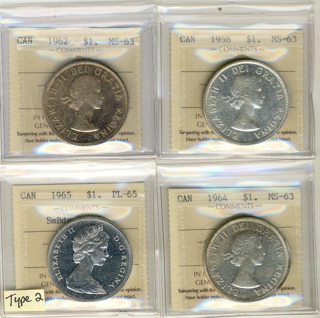 1958 $1, 1962, 1964 ICCS MS63 & 1965 SmBds Blt PL65. Lot of 4 ICCS coins.