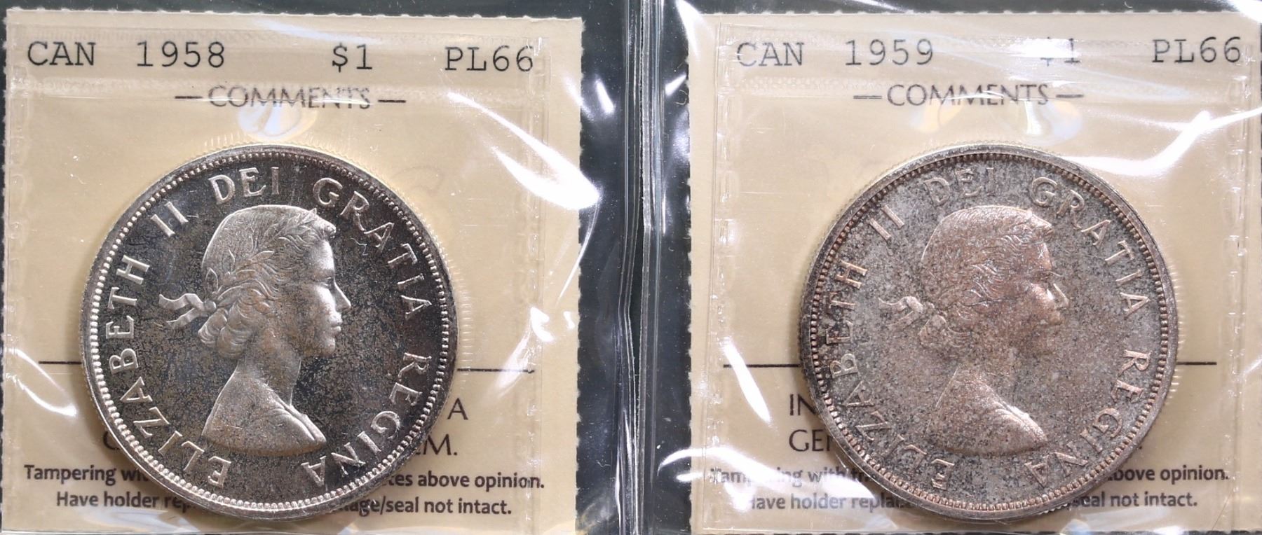 1958 $1 Cameo & 1959 ICCS Superb Gem Proof-Like-66. Lot of 2 coins both with attractive light tones.