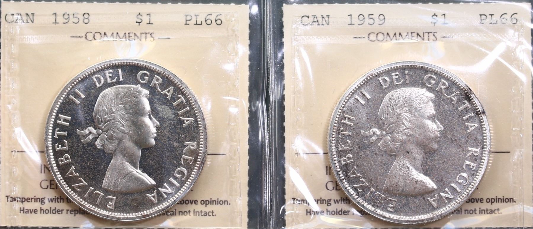 1958 $1 Cameo & 1959 ICCS Superb Gem Proof-Like-66. Lot of 2 coins both with attractive light tones.