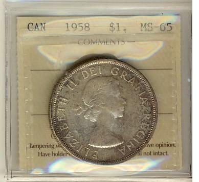 1958 $1 ICCS MS65. Light golden brown tint.