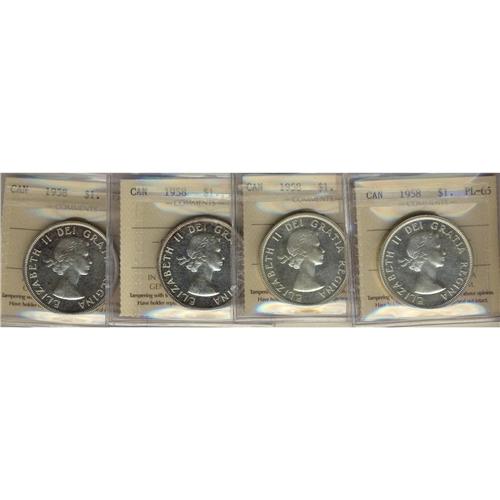 1958 $1 ICCS PL65. Lot of 4 coins all same grade, one with cameo.