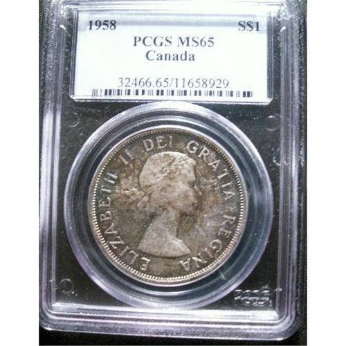 1958 $1 PCGS MS65. Superb toning over full underlying luster. A very flashy coin.