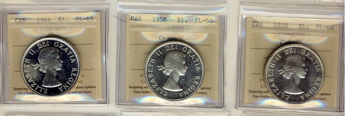 1958 $1 PL66 Cameo(2) & 1964 $1 PL65. Lot of 3 coins all ICCS graded.