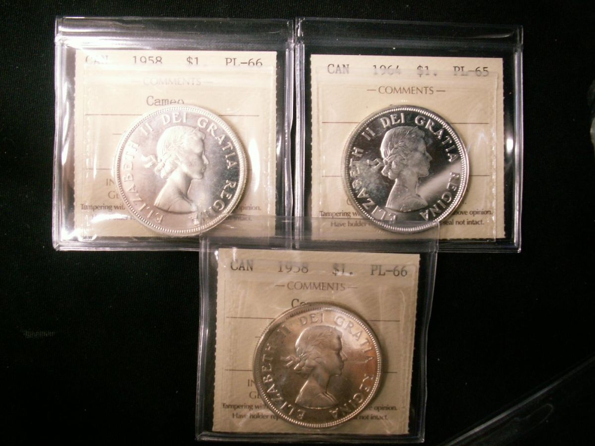 1958 $1 PL66 Cameo(2) & 1964 $1 PL65. Lot of 3 coins all ICCS graded.