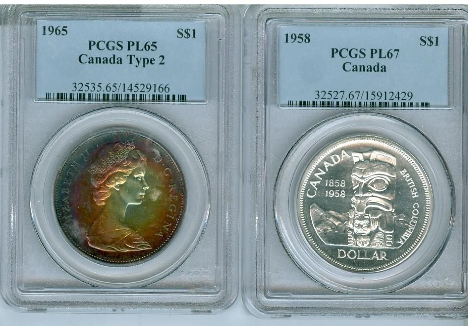 1958 $1 PL67 & 1965 Type 2 PL65. Lot of 2 coins both PCGS graded.