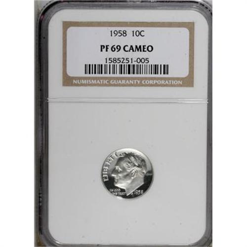 <B>1958 10C PR69 Cameo NGC.</B></I> NGC Census: (50/0). PCGS Population (2/0). Numismedia Wsl. Price for NGC/PCGS coin in PR69: $124. (#85233)<BR><BR><b>Shipping:</b> Coins & Currency (<a target="_blank" href="http://www.heritageauctions.com/common/shipping.php">view shipping information</a>)