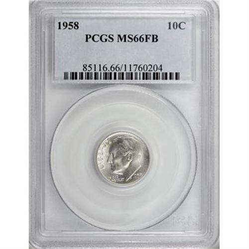 <B>1958 10C MS66 Full Bands PCGS.</B></I> PCGS Population (26/2). NGC Census: (0/0). Mintage: 31,100,000. (#85116)<BR><BR><B>Coin Engraver:</B> John R. Sinnock<BR><BR><b>Shipping:</b> Coins & Currency (<a target="_blank" href="http://www.heritageauctions.com/common/shipping.php">view shipping information</a>)