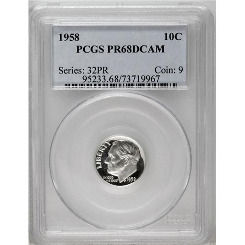 <B>1958<10C> PR68 Deep Cameo PCGS.</B></I> This brilliant and exactingly struck specimen displays unusual white-on-black cameo contrast for its production era. An exceptional proof Roosevelt dime. Population: 19 in 68, 2 finer (5/06).