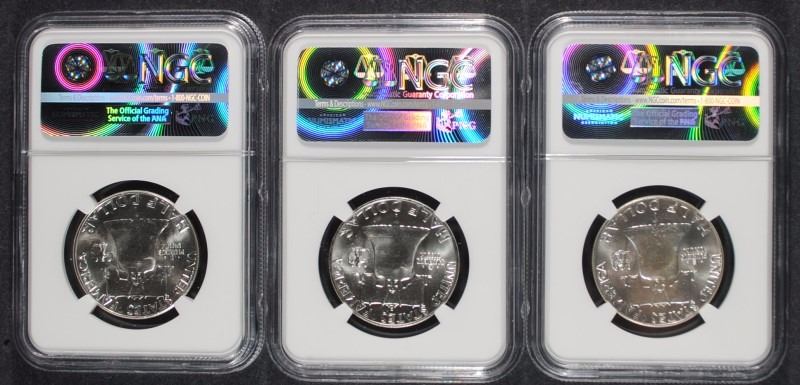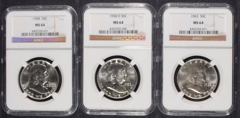 1958, 1958-D & 1963 FRANKLIN HALF DOLLARS, NGC MS-64