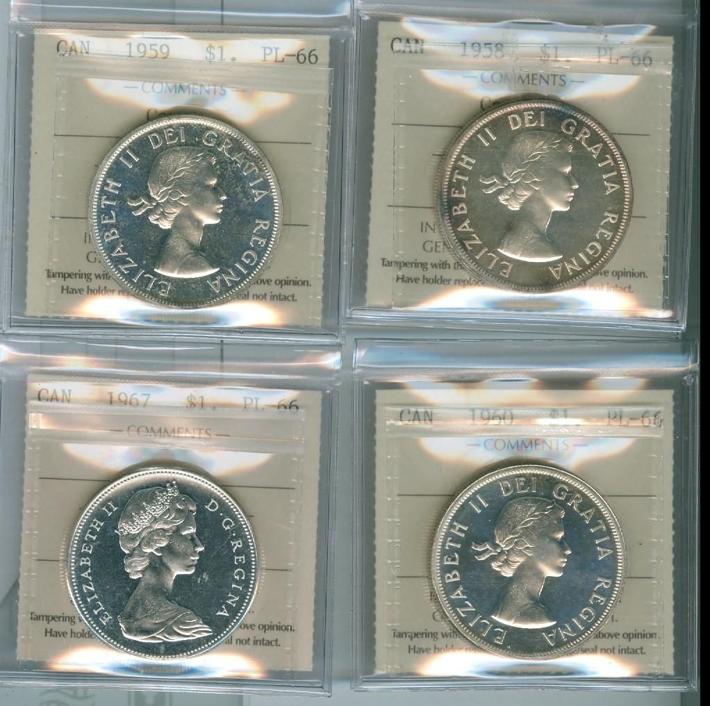 1958, 1959, 1960 & 1967 $1.  Lot of four coins all ICCS PL66 Cameo except for the 1967 which doesn't have the Cameo designation.