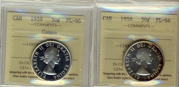 1958 & 1959 50¢ ICCS PL66. Lot of 2 coins, 1959 cameo.