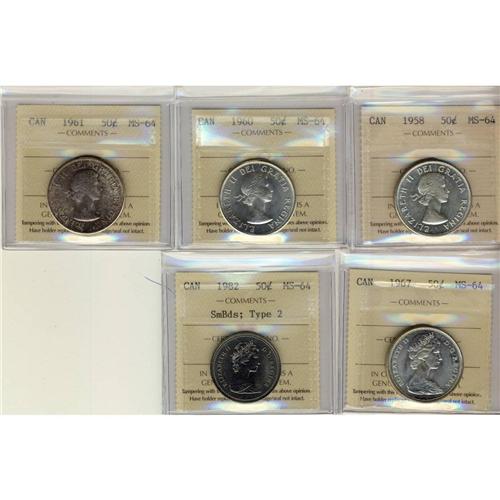 1958, 1960, 1961, 1967 and 1982 Type 50¢. Lot of 5 coins all ICCS MS64.