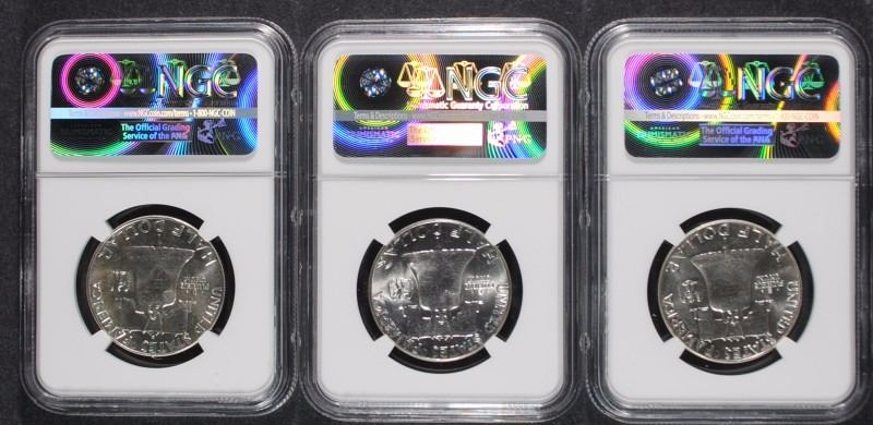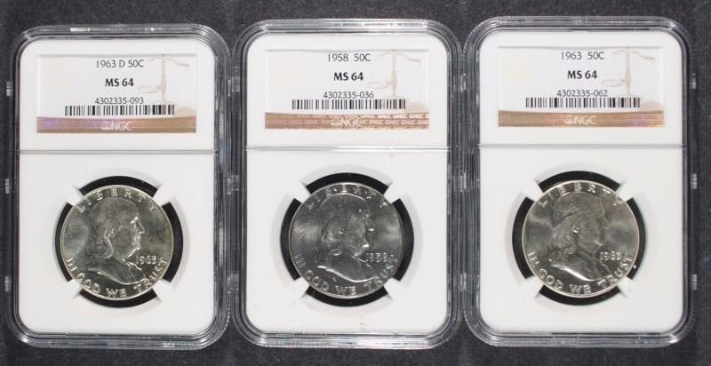 1958, 1963 & 1963-D FRANKLIN HALF DOLLARS, NGC MS-64