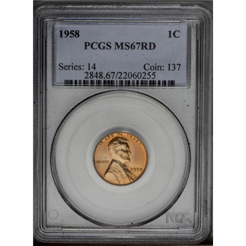 <B>1958<1C> MS67 Red PCGS.</B></I> Frosty and lustrous with brilliant light orange surfaces. Final year of issue for the wheat-back design. This example is tied for the finest certified. Population: 16 in 67, 0 finer (3/06). <BR><BR><B>Important notice:</B> Heritage usually auctions material at the rate of 200-250 lots per hour. On some occasions eBay Live bid software or the Internet may not be able to keep up with the pace of the auction. We recommend placing a realistic absentee bid now as insurance to avoid disappointment. Occasionally the auctioneer may eliminate or reject an eBay Live bid, and the auctioneer may also reopen a lot after the close of the eBay live bidding (usually because we missed an audience bid), and may reject your bid even if it shows you as the winning bidder. By bidding via eBay Live, you agree that Heritage may award the lot to another bidder at its sole discretion under the circumstances described above or any other reasonable circumstances. Since eBay bids are not shown to us until we open the lot on the floor, we treat those bids just like floor bids. In most cases the floor responds before the eBay bid is presented to us, due to Internet lag time, so for consistency we have made it a policy that floor bids are always considered first over tie eBay live bids. Also please note that all Heritage lots purchased through eBay Live carry a 20% Buyer's Premium. Please make sure you read the Terms and Conditions before you bid. This lot is being auctioned in conjunction with a live floor auction by Heritage Galleries & Auctioneers. All final auction and invoice information will be supplied by Heritage Galleries & Auctioneers, and all other information should be considered preliminary. Lot:683 <BR><BR><B>Winning Notification and Billing:</B> After the FINAL session in this auction is complete, Heritage will send e-mail and snail mail invoices. This process normally takes several days. All final auction and invoice information will be supplied by Heritage Galleries & Auctioneers, and all other information should be considered preliminary. <BR><BR>This auction will be conducted on a live auction floor and over the Internet through eBay Live. If you choose to place an absentee bid, please take a moment to <font color='#0000ff'><u><a href='http://pages.ebay.com/liveauctions/help/before/laabsentee.html'>learn how eBay Live absentee bidding works</a></u></font><font color='#000000'>