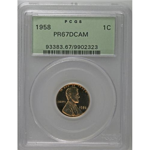 <B>1958<1C> PR67 Deep Cameo PCGS.</B></I> Dazzling mirror fields and luminous devices confirm the Deep Cameo contrast. A solitary fleck beneath the S in TRUST prevents perfection. Encased in a green label holder, and destined for a highly competitive Registry holding. Population: 21 in 67, 4 finer (8/06).