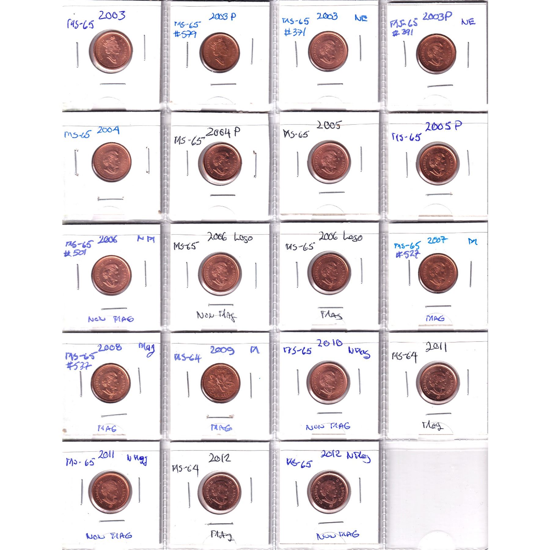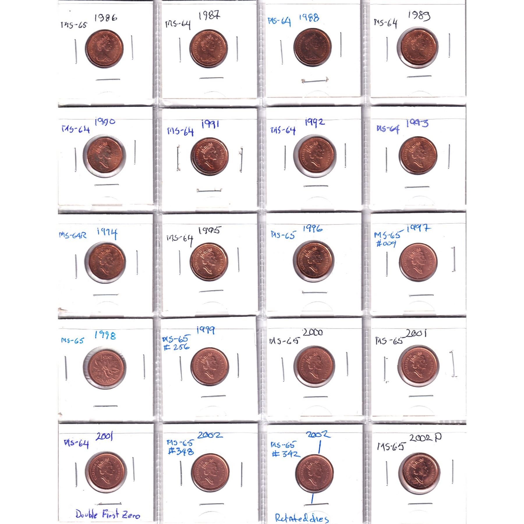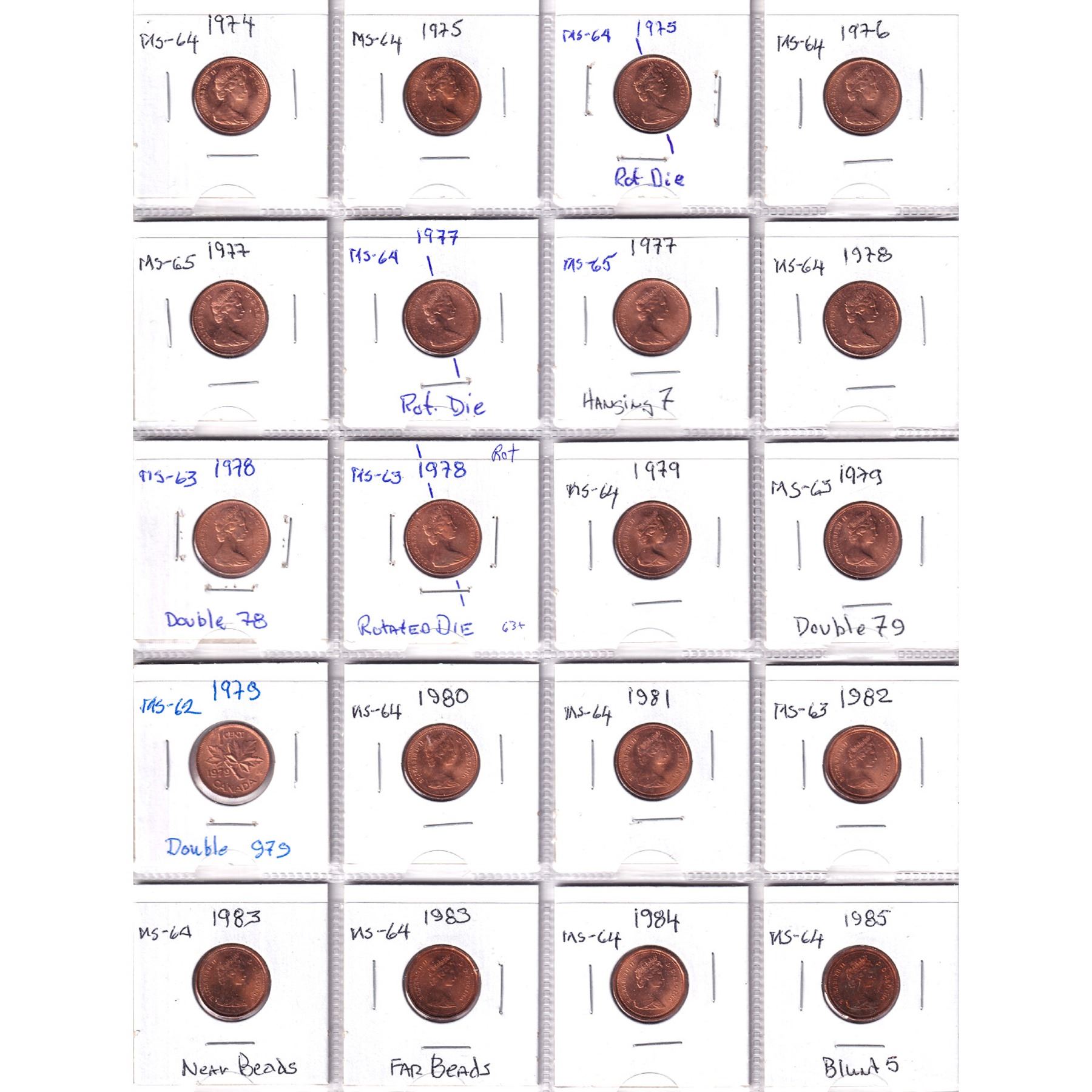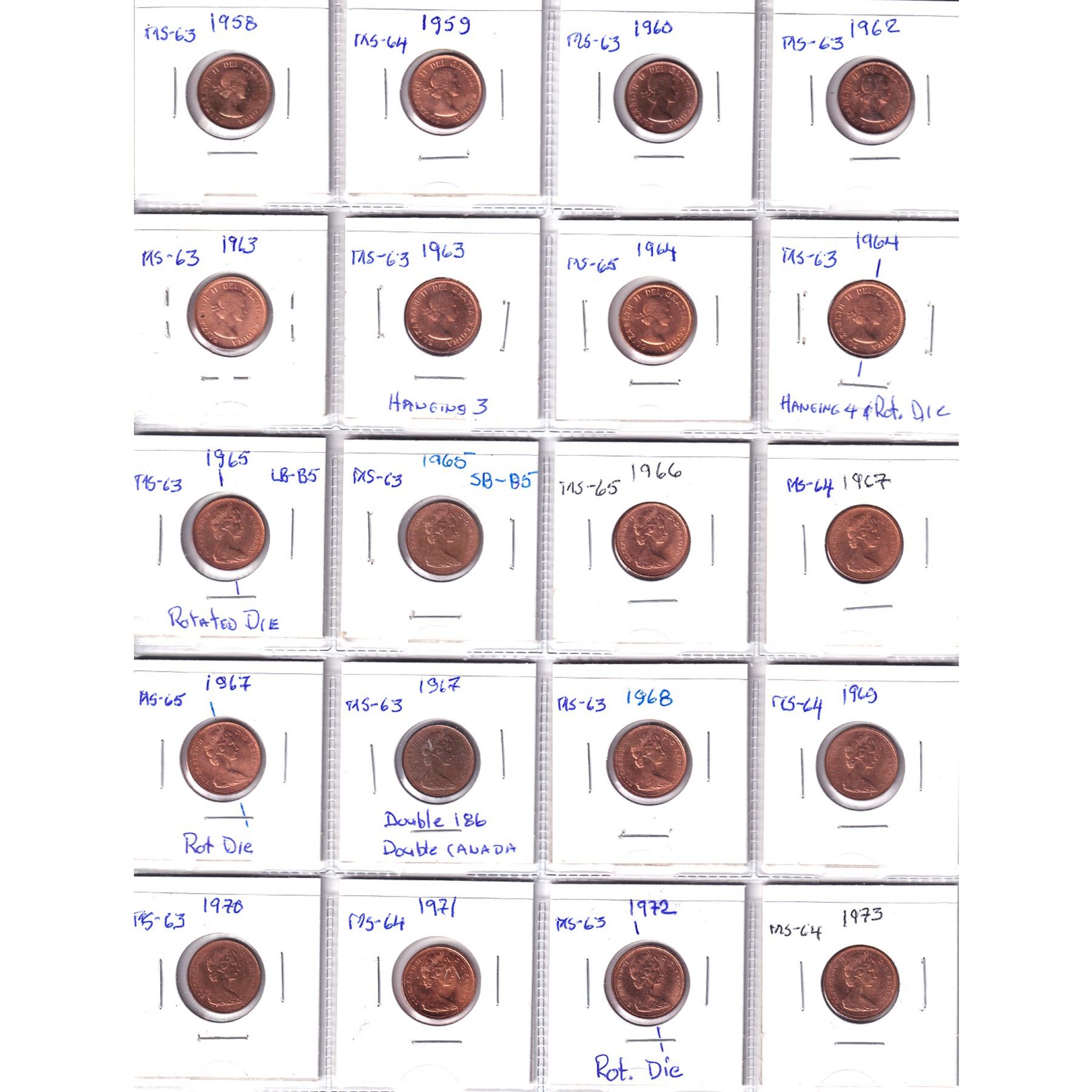 1958-2012 Canada 1-cent in Plastic Pages. You will receive coins that are all in Brilliant Uncirculated Or better condition, almost all red or full red, with many varieties included (rotated die, hanging double digits in date). 79pcs