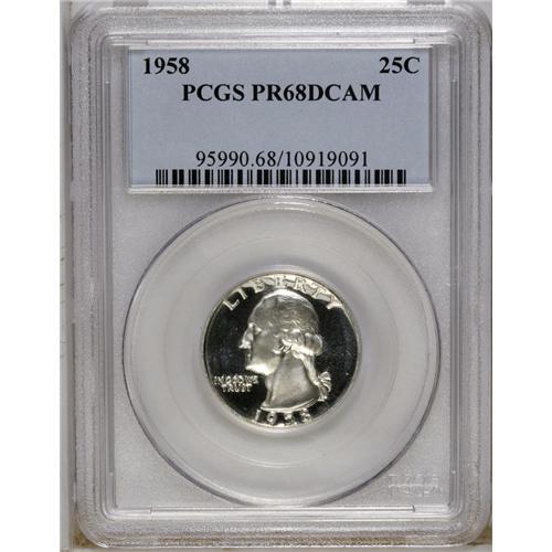 <B>1958 25C PR68 Deep Cameo PCGS.</B></I> Fewer than 30 1958 proof quarters, out of an original mintage of 875,652 pieces, have been given the Deep Cameo designation by PCGS and NGC. This PR68 specimen displays speckles of light gold color under magnification, and is exceptionally well struck. Both sides are immaculately preserved. Population: 17 in 68 Deep Cameo, 5 finer (12/06).<BR><BR><b>Shipping:</b> Coin/Currency (<a target="_blank" href="http://www.heritageauctions.com/common/shipping.php">view shipping information</a>)