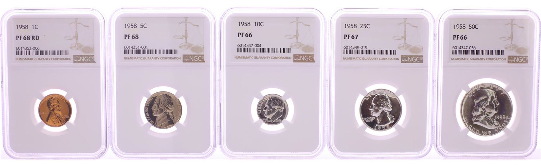 One 1958 (5) Coin Proof Set Graded NGC PF66/67/68. NGC Certified.