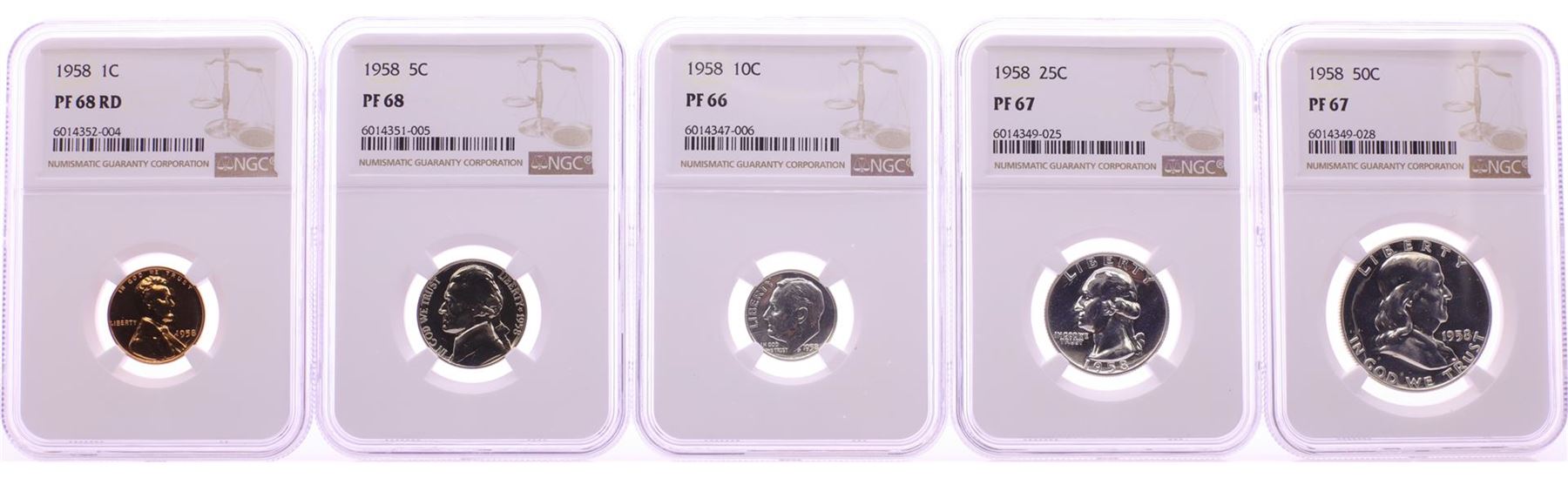 One 1958 (5) Coin Proof Set Graded NGC PF66/67/68. NGC Certified.