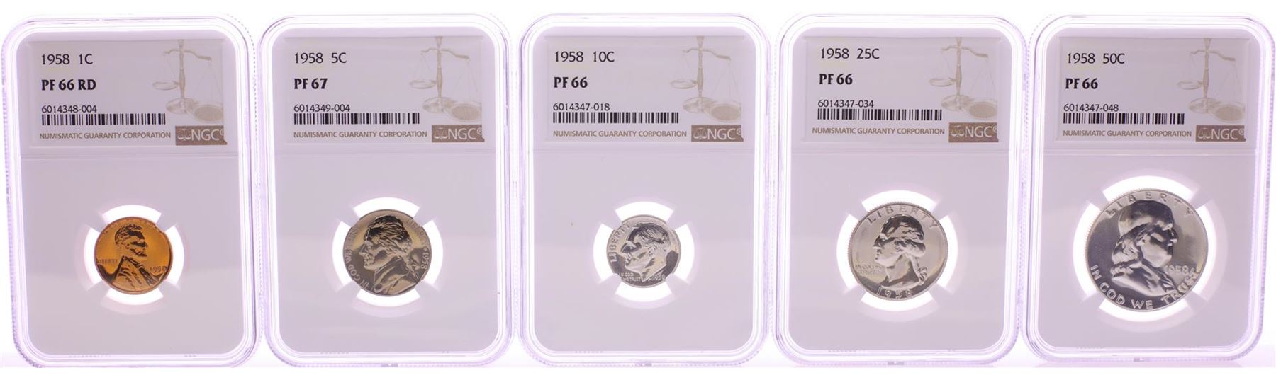 One 1958 (5) Coin Proof Set Graded NGC PF66/67. NGC Certified.