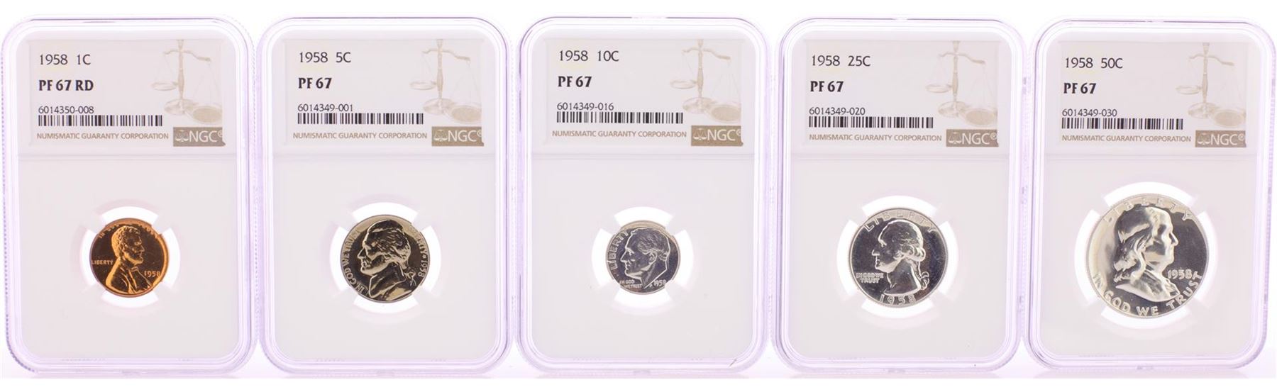 One 1958 (5) Coin Proof Set Graded NGC PF67. NGC Certified.