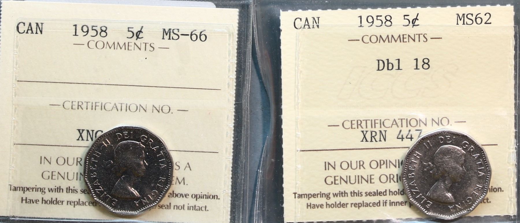 1958 5¢ "Dbl 18" Choice Mint State-62, 1958 Superb Gem Mint State-66, both ICCS graded.
