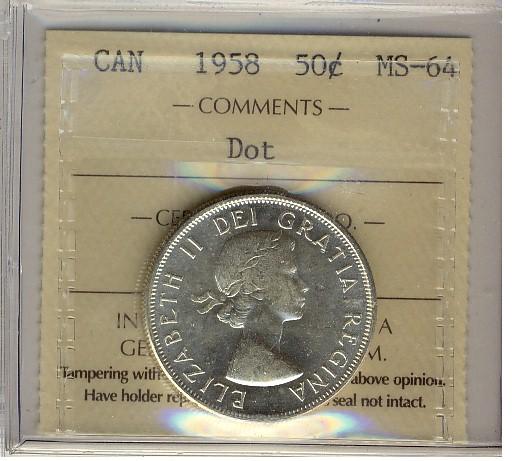 1958 50¢ Dot ICCS MS64
