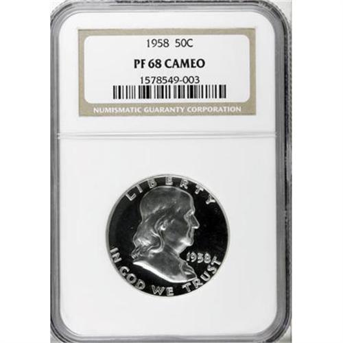 <B>1958 50C PR68 Cameo NGC.</B></I> NGC Census: (162/5). PCGS Population (41/1). Numismedia Wsl. Price for NGC/PCGS coin in PR68: $600. (#86699)<BR><BR><b>Shipping:</b> Coins & Currency (<a target="_blank" href="http://www.heritageauctions.com/common/shipping.php">view shipping information</a>)
