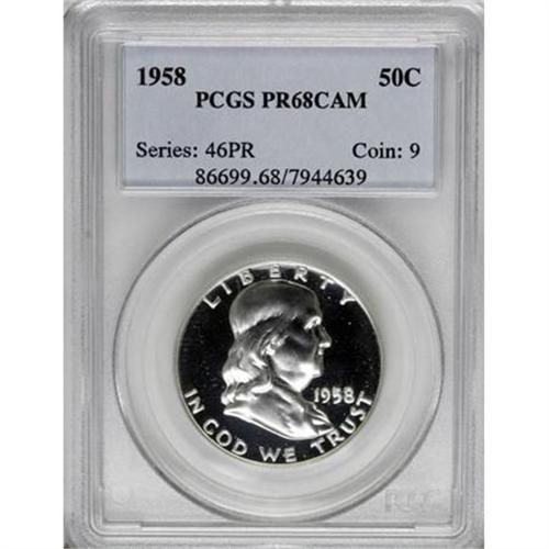 <B>1958 50C PR68 W Cameo PCGS.</B></I> PCGS Population (41/1). NGC Census: (162/5). Numismedia Wsl. Price for NGC/PCGS coin in PR68: $600. (#86699)<BR><BR><b>Shipping:</b> Coins & Currency (<a target="_blank" href="http://www.heritageauctions.com/common/shipping.php">view shipping information</a>)