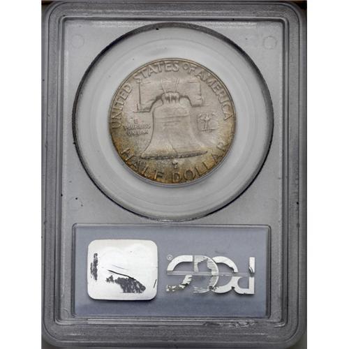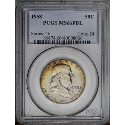 <B>1958<50C> MS66 Full Bell Lines PCGS.</B></I> Lovely sunset colors reside near the upper obverse border, with pastel olive and green hues below. The reverse also exhibits attractive toning variations, over well struck, lightly abraded surfaces. A gorgeous Premium Gem.<BR><I>From The Alex & Nan Registry Sets.</B></I> <BR><BR><B>Important notice:</B> Heritage usually auctions material at the rate of 200-250 lots per hour. On some occasions eBay Live bid software or the Internet may not be able to keep up with the pace of the auction. We recommend placing a realistic absentee bid now as insurance to avoid disappointment. Occasionally the auctioneer may eliminate or reject an eBay Live bid, and the auctioneer may also reopen a lot after the close of the eBay live bidding (usually because we missed an audience bid), and may reject your bid even if it shows you as the winning bidder. By bidding via eBay Live, you agree that Heritage may award the lot to another bidder at its sole discretion under the circumstances described above or any other reasonable circumstances. Since eBay bids are not shown to us until we open the lot on the floor, we treat those bids just like floor bids. In most cases the floor responds before the eBay bid is presented to us, due to Internet lag time, so for consistency we have made it a policy that floor bids are always considered first over tie eBay live bids. Also please note that all Heritage lots purchased through eBay Live carry a 20% Buyer's Premium. Please make sure you read the Terms and Conditions before you bid. This lot is being auctioned in conjunction with a live floor auction by Heritage Galleries & Auctioneers. All final auction and invoice information will be supplied by Heritage Galleries & Auctioneers, and all other information should be considered preliminary. Lot:3120 <BR><BR><B>Winning Notification and Billing:</B> After the FINAL session in this auction is complete, Heritage will send e-mail and snail mail invoices. This process normally takes several days. All final auction and invoice information will be supplied by Heritage Galleries & Auctioneers, and all other information should be considered preliminary. <BR><BR>This auction will be conducted on a live auction floor and over the Internet through eBay Live. If you choose to place an absentee bid, please take a moment to <font color='#0000ff'><u><a href='http://pages.ebay.com/liveauctions/help/before/laabsentee.html'>learn how eBay Live absentee bidding works</a></u></font><font color='#000000'>
