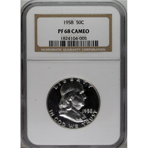 <B>1958 50C PR68 Cameo NGC.</B></I> NGC Census: (161/5). PCGS Population (41/1). Numismedia Wsl. Price: $600. (#86699)<BR><BR><b>Shipping:</b> Coins & Currency (<a target="_blank" href="http://www.heritageauctions.com/common/shipping.php">view shipping information</a>)