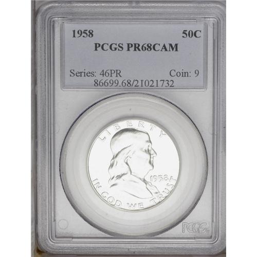 <B>1958<50C> PR68 Cameo PCGS.</B></I> An outstanding cameo example from this widely collected series. Both sides are brilliant and well matched in appearance with unfathomably deep mirrors and noticeable mint frost over the devices. Population: 40 in 68, 1 finer (4/06).