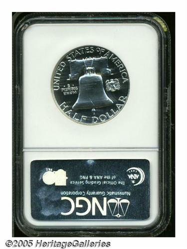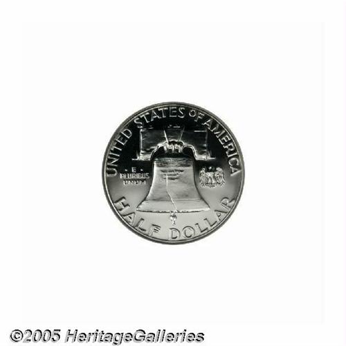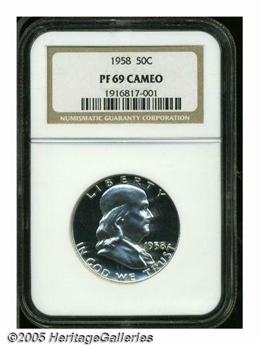 <B>1958<50C> PR69 Cameo NGC.</B></I> The deep mirrored fields of this example provide stark contrast for the lightly frosted devices. The surfaces are untoned and impeccably well preserved. A stunning cameo that is virtually unimprovable. This is one of only six specimens certified at this level by NGC and PCGS combined, with no examples rating higher (6/05).