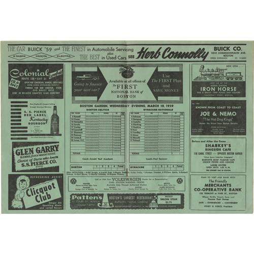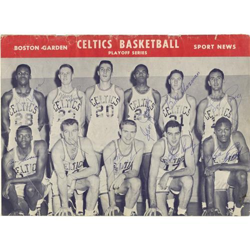 <B>1958-59 Boston Celtics Team Signed Program.</B></I> A four-game sweep over the Minneapolis Lakers earned this storied franchise its second World Championship in three years, delivering a stinging blow to the segregationists who disapproved of the team's racial diversity. Ten of the eleven members of Red Auerbach's superstar club pictured on the cover of this Boston Garden program have signed in 9/10 or better blue ink: K.C. Jones, Ramsey, Sam Jones, Sharman, Cousy, Swain, Loscutoff, Heinsohn, Conley and Russell. With six Hall of Famers, this team represents arguably the most talent-packed professional franchise in American sports history. This special autographed artifact, showing typical handling wear but remaining solid and complete, is truly a treasure for the ages, deserving of the finest basketball memorabilia collections. <I>LOA from PSA/DNA. LOA from James Spence Authentication.</B></I><BR><BR><b>Shipping:</b> Flat Material, Small (<a target="_blank" href="http://www.heritageauctions.com/common/shipping.php">view shipping information</a>)