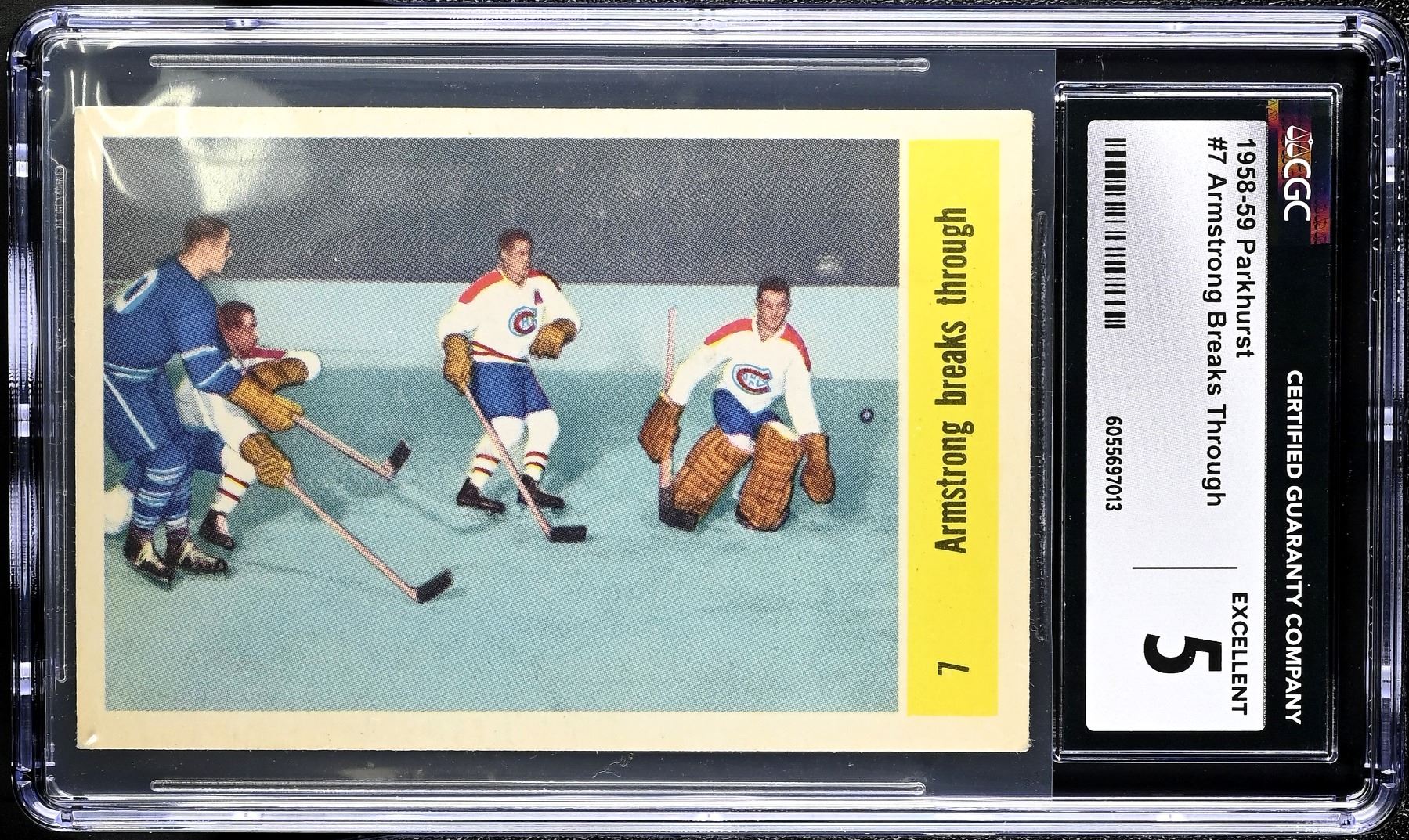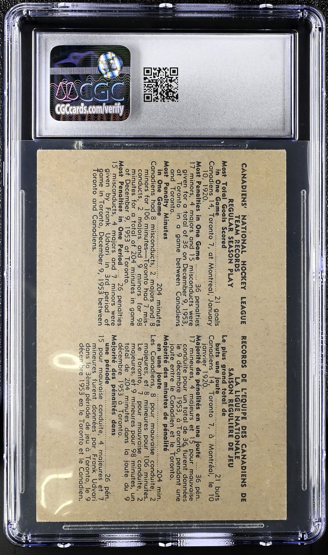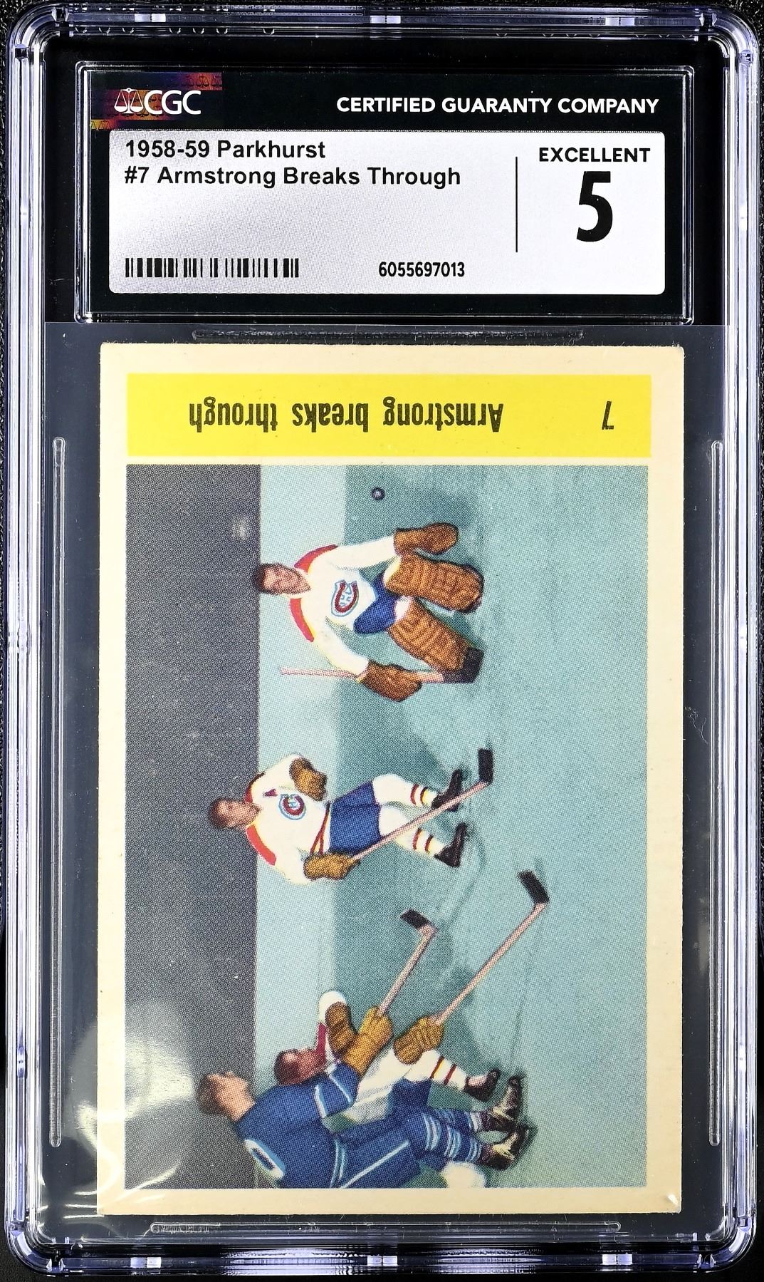 Clean action card featuring HOFer and Leafs captain, George Armstrong. Others look like HOFer Tom Johnson and goaltender Gerry McNeil. Graded 5 EX by CGC.
