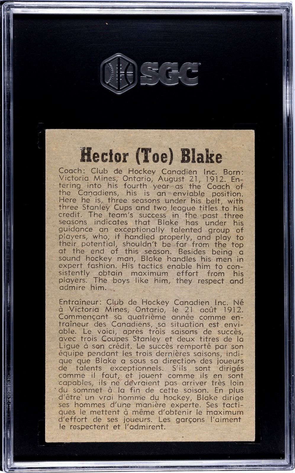 Classic Toe Blake card with the Canadiens jacket! All-time great HOFer who was both an MVP player and one of the most successful coaches in NHL history. His name is synonymous with "old time hockey" thanks to the movie "Slapshot". Graded a sharp 6 EX-NM by SGC!