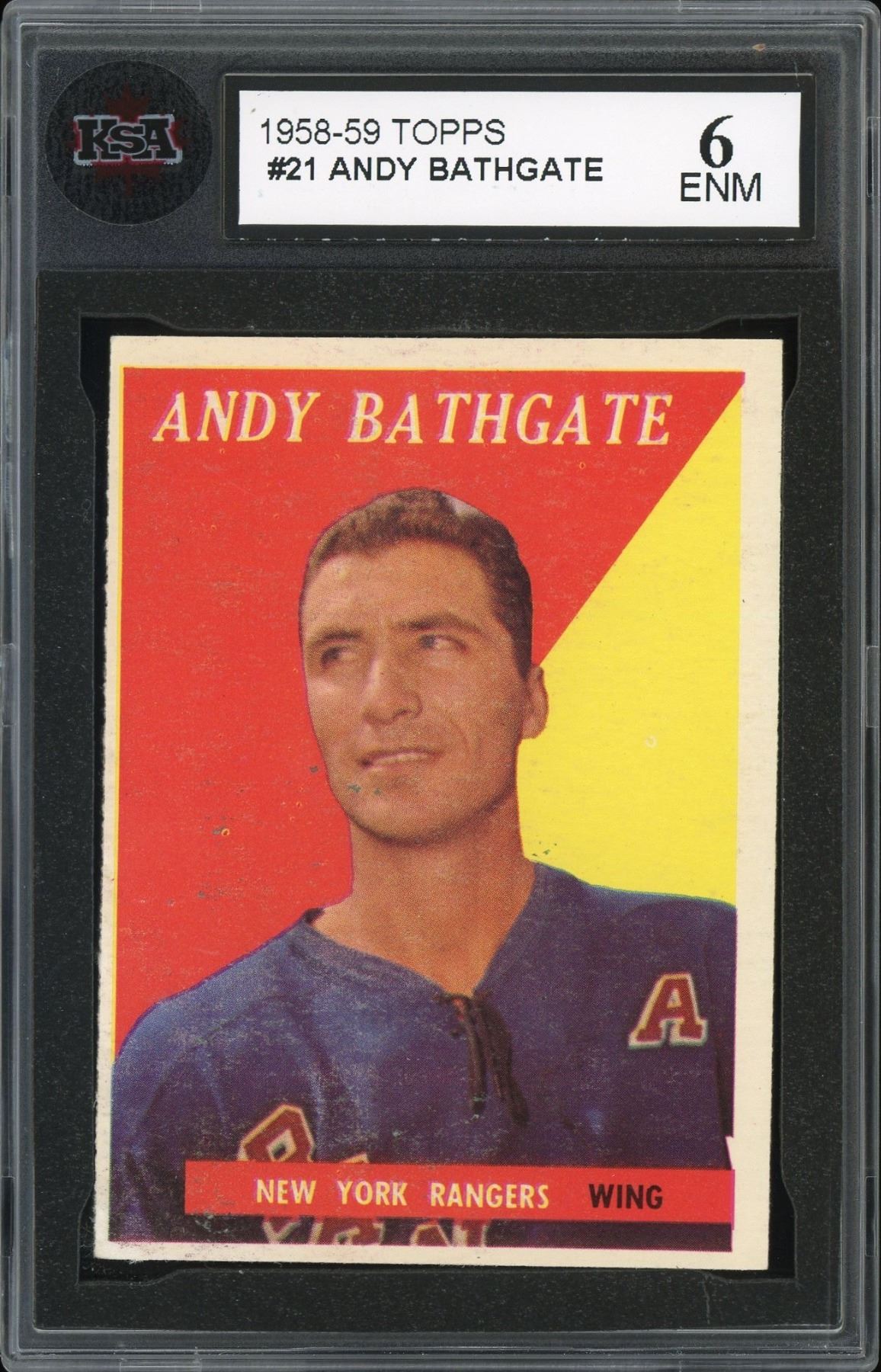 NY Rangers great and HOFer Andy Bathgate played 17 seasons in the NHL, as well as several more in the high minors. He was the Hart Trophy (MVP) winner in 1959 and WHL MVP in 1970. He made numerous all-star teams/games, and won championships in junior, the AHL, the WHL and a Stanley Cup. Graded 6 EX-NM by KSA.